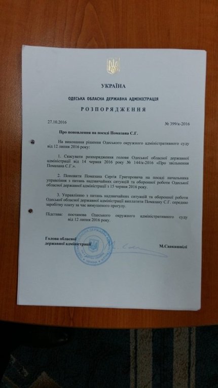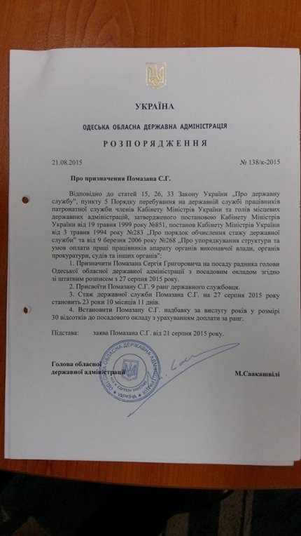 "Внизу ви зможете прочитати документи, де Саакашвілі і брав на роботу Сергія Помазана, і відновлював його на посаді. Відійдемо від особистості затриманого, не суть поста. Важливо інше. Я і тоді був упевнений, що Ніколозович вже давно не розрізняє, де популізм, а де брехня, Зараз просто вдалося це продемонструвати наочно. Сподіваюся, це колишнє непорозуміння, вже ніколи не з'явиться в Одесі або Одеській області в ранзі більше, ніж відпочиваючий..." - додав він і надав копії документів.