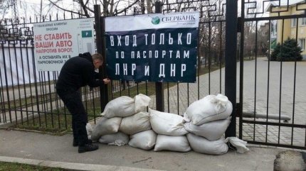 Близько сотні активістів встановили бетонні блоки, мішки з піском і плакати на вході в офіс. Зокрема, деякі з написів свідчать: "Вхід тільки за паспортами ЛНР-ДНР", "Ласкаво просимо в Росію".