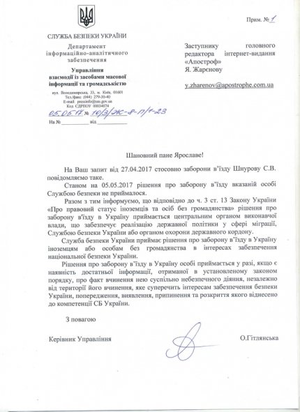"Станом на 05.05.2017 рішення про заборону в'їзду зазначеної особи Службою безпеки не приймалося", - йдеться у відповіді СБУ на запит видання.