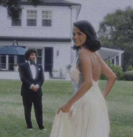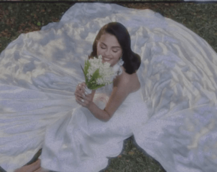 Селена Гомес була одягнена в атласну білу сукню від бренду Ralph Lauren з ручною вишивкою. Свій образ нареченої співачка доповнила прикрасами від Tiffany & Co й букетом конвалій.