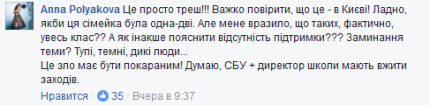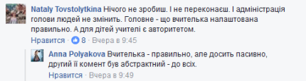 "Розуміють моє обурення. Домовилися, що на найближчих батьківських зборах не тільки в нашому класі, а й у всіх, буде розмова про патріотичне виховання, і школа заявить про свою патріотичну позицію всім батькам", - повідомила вона.