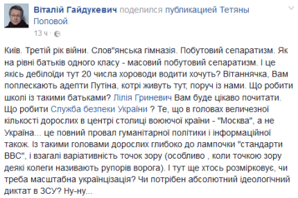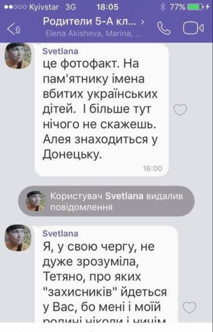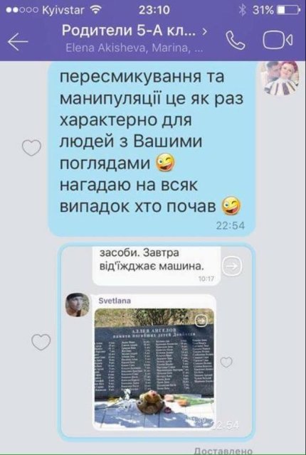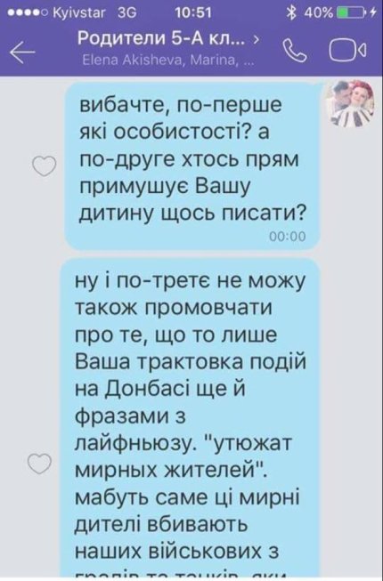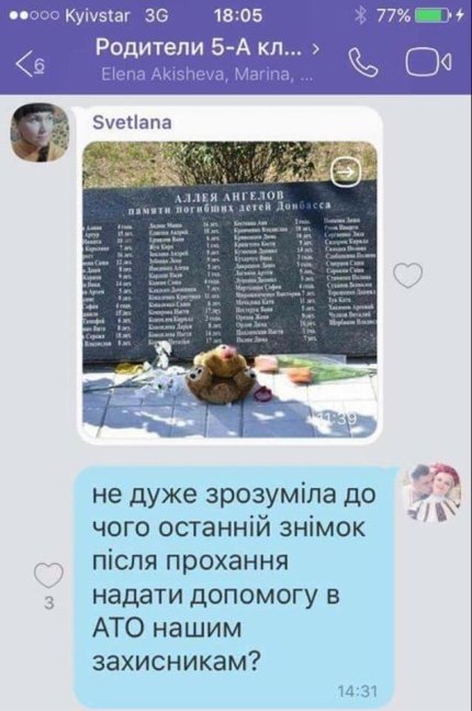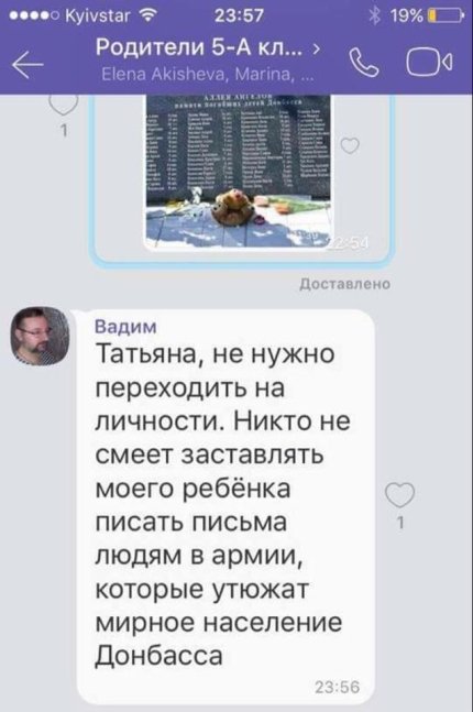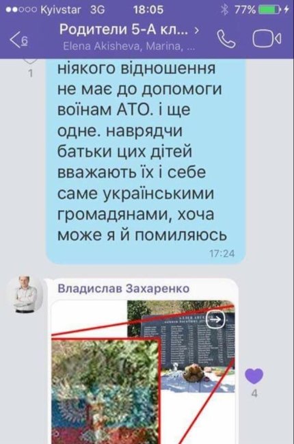 Скандал почався після того, як класний керівник звернувся до батьків своїх учнів з питанням про допомогу воїнам АТО, і у відповідь отримав фото меморіалу "загиблим дітям Донбасу" і заяву про те, нібито ЗСУ "утюжать мирне населення".