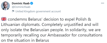 "Велика Британія засуджує рішення Білорусі вислати польських і литовських дипломатів. Воно повністю невиправдене і буде лише ще більше ізолювати білоруський народ. На знак солідарності ми тимчасово відкликаємо нашого посла для консультацій щодо ситуації в Білорусі", - повідомив про рішення Лондона глава британського МЗС Домінік Рааб.