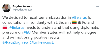 "Ми вирішили відкликати нашого посла в Білорусі для консультацій в знак солідарності з Литвою і Польщею. Білорусь повинна зрозуміти, що використання дипломатичного тиску на країни - учасниці Євросоюзу не допоможе діалогу і не принесе позитивних результатів", - повідомив про відкликання румунських послів з Білорусі Ауреску .
