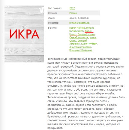 Нагадаємо, Дарина Мороз знімалася у багатьох фільмах, серед яких: "Оттепели", "Достоєвський", "Загибель імперії", "Будинок з ліліями", "А зорі тут тихі" та інші.