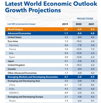 Також наголошується, що падіння ВВП Штатів у поточному році становитиме 8%, а відновлення у 2021 - 4,5%, у ФРН - 7,8% падіння у 2020 та 5,4% відновлення у 2021. За попередніми даними, найбільше падіння, як і раніше, очікується в Італії і в Іспанії - на 12,8%, зростання в цих країнах в наступному році прогнозують на рівні 6%. У Франції зниження, за прогнозами, становитиме 12,5%, зростання в наступному році - на 7,3%. ВВП Великої Британії впаде в 2020 році, на думку МВФ, на 10,2%, хоча раніше МВФ очікував зниження на 6,5%, а в 2021 році зросте на 6,3%.