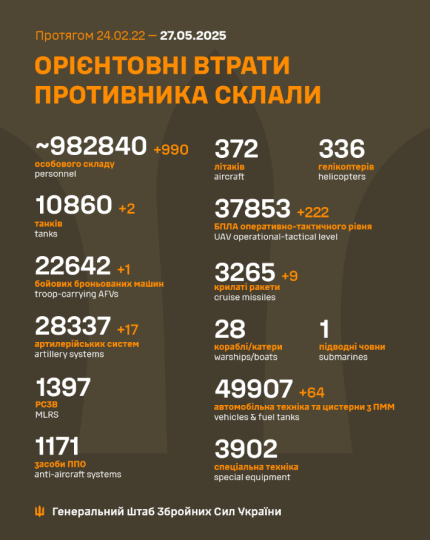 Загальні бойові втрати росіян з 24.02.22 по 27.05.25 орієнтовно склали: