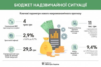 Вказано, що номінальний ВВП прогнозується на рівні 4 трлн грн, тоді як раніше він оцінювався в 4,51 трлн грн. Окрім того, прогноз безробіття погіршений з 8,1% до 9,4%, а середньомісячної зарплати - з 12,5 тис. грн до 11 тис. грн, що з урахуванням інфляції відповідає рівню минулого року.