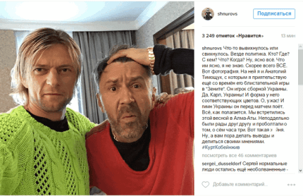 "Щось вивихнулося або збожеволіло. Скрізь політика. Хто? Де? З ким? Що? Коли? Ну, ясно все. Що їм ясно, я не знаю. Швидше за все ВСЕ. Ось фотографія. На ній я і Анатолій Тимощук, з яким я приятелюю ще з часів його блискучої гри в "Зеніті". він гравець збірної України. Так, Карл, України! І форма у нього відповідних кольорів. О, жах! І гімн України він перед матчем співає. Все, як годиться", - підписав фотографію Шнуров.