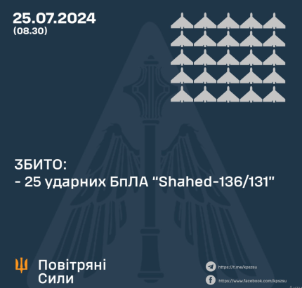 У ніч проти 25 липня армія РФ атакувала Україну 38 ударними дронами типу Shahed 131/136. Українська протиповітряна оборона збила 25 ворожих дронів.