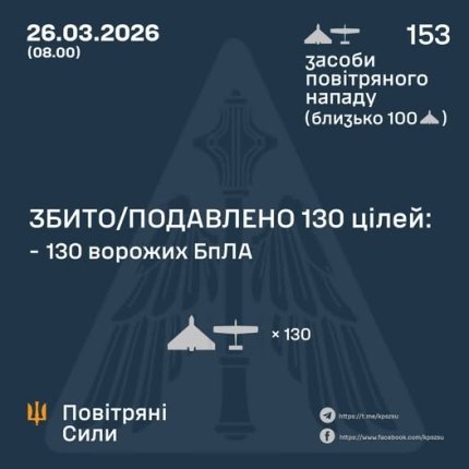 За попередніми даними, станом на 08:00 четверга, 26 березня, протиповітряна оборона збила / подавила 130 БПЛА на півночі, півдні та сході України.