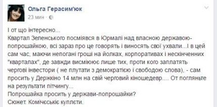 «І ось що цікаво ... Квартал Зеленського посміявся в Юрмалі над власною державою-жебраком, всі зараз про це говорять і виносять свої рішення ... І в цей же самий час, маючи непогані гроші на ялинках, корпоративах і нескінченних "кварталах", де завжди висміює тільки тих, проти кого заплатять чергові інвестори (не плутати з демократією і свободою слова), - сам просить у Держкіно 14 млн на свій черговий кіношедевр.... Жебрак просить у держави-жебрачки? Сюжет. Комічні куплети», - написала в Facebook перший заступник голови Національної ради України з питань телебачення і радіомовлення Ольга Герасим'юк.