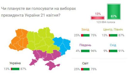 87% громадян України планують взяти участь в другому турі президентських виборів, які проходять сьогодні, 21 квітня. За межами країни цей відсоток дещо нижчий - лише 75%, повідомляє ONLINE.UA з посиланням на дані власного опитування.