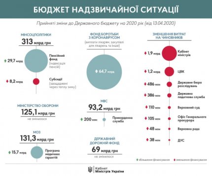 Він навів таблицю, в якій розписано бюджет надзвичайної ситуації. У ній зазначено, що кошти з створеного Фонду боротьби з COVID-19 обсягом 64,7 млрд грн будуть спрямовані на підвищення виплат працівникам, закупівлю медичного обладнання, соціальну підтримку пенсіонерів та тих, хто втратив роботу. Додатково в бюджеті пенсійне забезпечення збільшено на 29,7 млрд грн, а фінансування Міністерства соціальної політики - на 19,5 млрд грн.