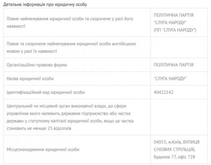 Відповідно до виписки з ЄДР, партія "Слуга народу" зареєстрована в Києві, на вулиці Січових стрільців.