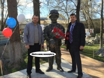 "Прототипом кота, якого тримає в руках солдат, послужив кіт Васька, що мешкає на території парку мініатюр. Пам'ятник максимально правдоподібно передає суть подій весни 2014 року. Його відкриття присвячено річниці приєднання Республіки Крим до Російської Федерації", - цитує Жиленко Наша Газета. Крим.