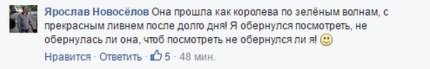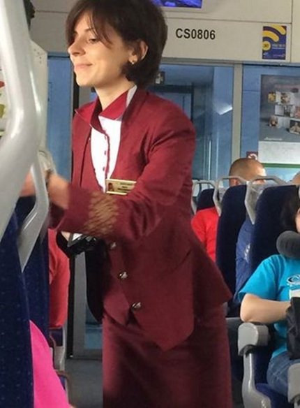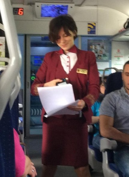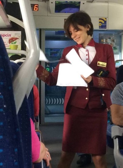"Вона впурхнула в вагон, притиснувши до грудей рідер штрих-кодів і чарівно посміхнулася: Шановні пасажири! Доброго ранку! Будь ласка, приготуйте Ваші проїзні документи! Весь цей час очі її виблискували, носик гордо стирчав вгору, лапки з затиснута в них рідером відчайдушно жестикулювали. Здавалося, ця дівчинка не працює, а виступає в самодіяльності і їй дуже важливо виступити якомога краще. і знаєте, слухаючи її, я повірив, що я таки дійсно шановний і ранок буде добрим", - пише він.