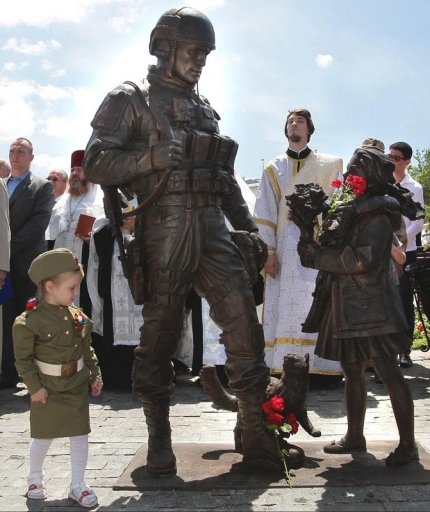 "А в сквері біля будівлі Держради Криму - ще один пам'ятник, свіжий - "ввічливим людям". Данина поваги тим, хто зробив реальним і відновлення монумента імператриці, і сотні інших речей, неможливих, поки півострів був відірваний від РФ. Дівчинка простягає квіти бійцю спецназу, як це не раз траплялося в дні возз'єднання. А поруч прилаштувався кіт, що ніби говорить "ввічливій людині": "Спасибі, що я більше не кiт!", - цитує публіциста його колега.