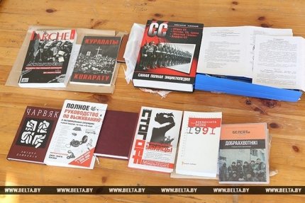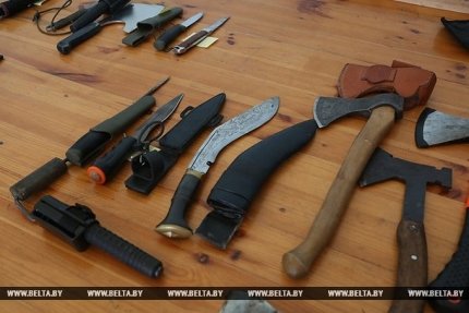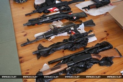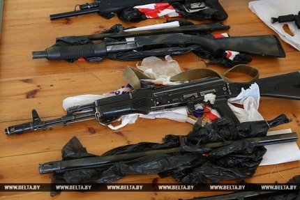 Так, було вилучено: автомат Калашникова, 3 карабіна, 2 пістолети, набої, гранати, кийки, метальні ножі і сокири, предмети і речовини для виготовлення саморобних вибухових пристроїв, військова форма, бронежилети, каски, медичні аптечки натовського зразка, різна атрибутика батальйону "Азов", "Тактичної групи Білорусь", УНА-УНСО, а також посібники з ведення бойових дій в місті.
