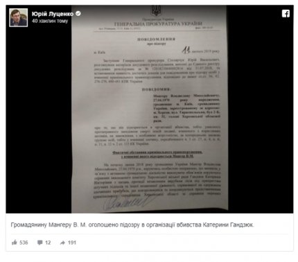 Генеральний прокурор України Юрій Луценко повідомляє, що голові обласної ради Херсонскої області Владиславу Мангеру оголосили підозру з організації вбивства Катерини Гандзюк, передає ONLINE.UA з посиланням на Facebook очільника ГПУ.