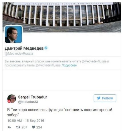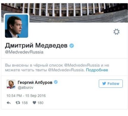 "Думаю, що зараз вже сотні людей можуть заявити таке в круглому столі: - Мене в твіттері в чорний список занесла колишня подруга. - А мене - колишній президент Російської Федерації", - пожартував опозиціонер.