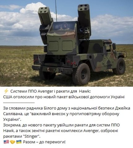 Сьогодні США оголосять про новий пакет військової допомоги Україні, до якого входитимуть важливі засоби протиповітряної оборони, як-то ракети для комплексів ППО Hawk, а також чотири системи Avenger, оснащених ракетами Stinger, – повідомив радник Байдена.