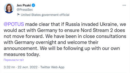 Президент США чітко дав зрозуміти, що якщо Росія вторгнеться в Україну, ми будемо діяти разом з Німеччиною, щоб гарантувати, що "Північний потік-2" не просувається, - сказала Псакі.