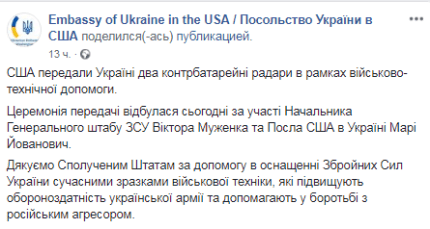 Посольство України подякувало Сполученим Штатам за допомогу в оснащенні ЗСУ сучасними зразками військової техніки, які підвищують обороноздатність української армії. Муженко при цьому підкреслив, що Україна стала першою країною в світі, якій США дозволили самостійно займатися технічним обслуговуванням і ремонтом таких радарів.