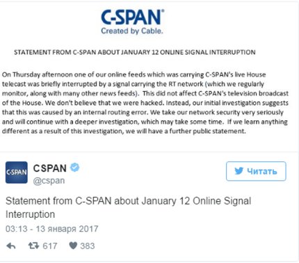 Ефір американського телеканалу Конгресу США C-SPAN раптово був перерваний трансляцією російського пропагандистського телеканалу Russia Today.
