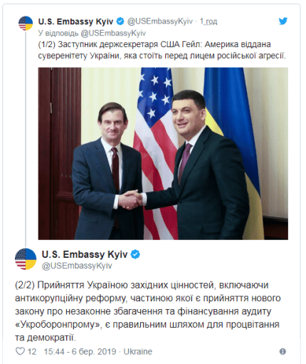 Заступник держсекретаря США з політичних питань Девід Гейл закликав Україну прийняти новий закон, що передбачає відповідальність за незаконне збагачення. Про це йдеться у повідомленні посольства США в Україні у Twitter, передає ONLINE.UA.