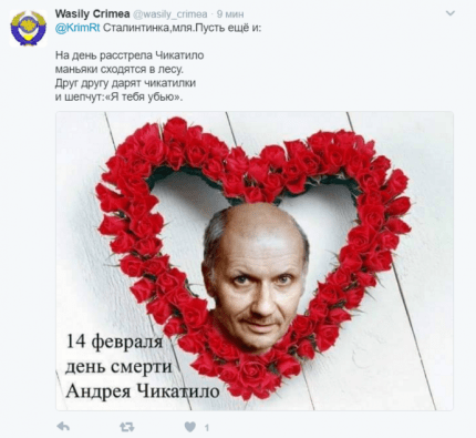 У соцмережах вже пародіюють "сталінтинку", нагадавши, що 14 лютого - день страти знаменитого маніяка-вбивці Андрія Чикатила.