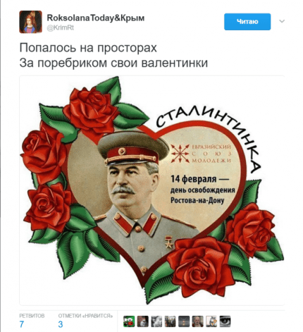 Як повідомляє ONLINE.UA, "сталінтинки" пропонують відзначати 14 лютого не як День закоханих, а як День звільнення Ростова-на-Дону від фашистів.