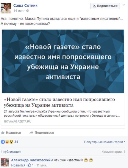 "Ага зрозуміло. Маска Путіна виявилася ще й "відомим письменником" ... А чому - не космонавтом? », - поіронізував в Facebook російський журналіст і блогер Олександр Сотник.