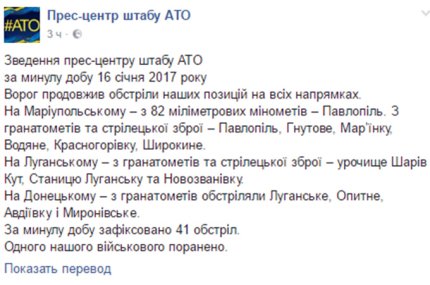 При цьому в прес-центрі штабу АТО в Facebook повідомили, що за добу 16 січня 2017 року ворог продовжив обстріл позицій ЗСУ на всіх напрямках в зоні АТО.