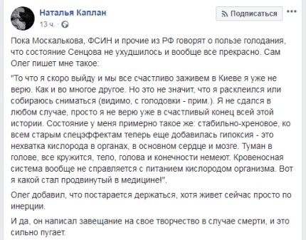 "Стан у мене приблизно такий ж: стабільно-паскудний, до всіх старих спецефектів тепер ще додалася гіпоксія - це нестача кисню в органах, в основному серці і мозку. Туман в голові, все крутиться, тіло, голова і кінцівки німіють. Кровоносна система взагалі не справляється", - написав Олег.