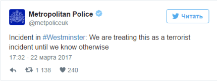 Одразу після інциденту парламент був закритий, і за кілька хвилин з його будівлі вийшла прем'єр-міністр країни Тереза Мей в оточенні охоронців.