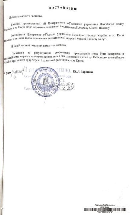 «Пенсійний фонд подав апеляцію на таке рішення суду і виграв її. У нашій суперечці крапку поставив Київський апеляційний адміністративний суд, який чітко визнав помилку Подільського суду і скасував рішення суду про відновлення виплати пенсії Азарову», - написав він.