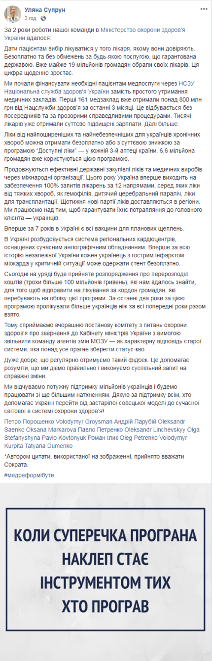 "Сприймаємо вчорашню постанову комітету з питань охорони здоров'я про звернення до Кабінету міністрів України з вимогою звільнити команду агентів змін МОЗУ – як характерну відповідь старої системи, яка понад усе прагне зберегти статус-кво. Дуже добре, що регулярно отримуємо такий фідбек. Це допомагає розуміти, що ми діємо правильно і виконуємо суспільний запит на справжні зміни", – заявила Супрун.