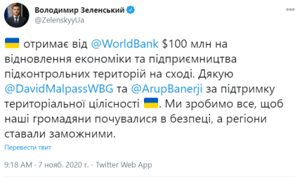 "Україна отримає від Світового банку 100 млн доларів на відновлення економіки і підприємництва підконтрольних територій на сході. Дякую за підтримку територіальної цілісності України. Ми зробимо все, щоб наші громадяни відчували себе в безпеці, а регіони ставали заможними", - прокоментував довгоочікуване рішення Всесвітнього банку Зеленський.