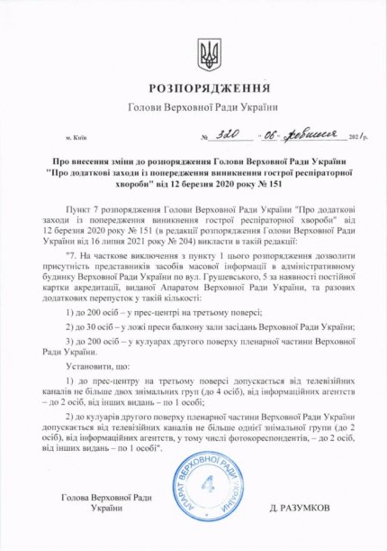 Відповідно до нового розпорядження Разумкова від 6 жовтня, тепер у прес-центрі на 3-му поверсі може працювати до 200 ociб, на балконі преси у залі засідань – 30 осіб, у кулуарах 2-го поверху – 200 осіб.