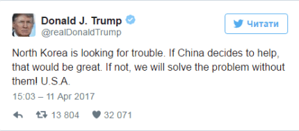 "Північна Корея шукає неприємностей. Якщо Китай вирішить допомогти, це буде чудово. Якщо ні, ми вирішимо цю проблему без них", - пообіцяв Трамп.