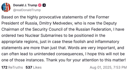 Президент США Дональд Трамп заявив про власне розпорядження щодо розміщення двох атомних підводних човнів у "відповідних районах" на випадок, якщо "дурні" і провокаційні заяви експрезидента РФ Дмитра Медведєва "виявляться чимось більшим".