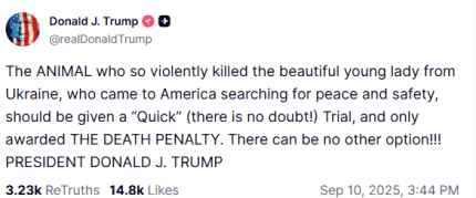 Тварина, яка жорстоко вбила прекрасну молоду дівчину з України, яка приїхала до Америки в пошуках миру та безпеки, повинна бути "швидко" (безсумнівно!) осуджена і засуджена лише до смертної кари. Іншого вибору не може бути.