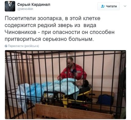 Так, користувач Сірий Кардинал написав: "Відвідувачі зоопарку, в цій клітці міститься рідкісний звір з виду Чиновників - при небезпеці він здатний прикинутися серйозно хворим".