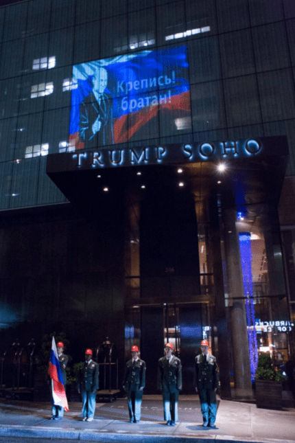 Перед будівлею готелю мережі, яка раніше належала Трампу, вишикувалися люди в формі, схожій на військову, і з прапором Росії. Над ними на будівлю падала проекція із зображенням усміхненого Путіна з піднятим догори великим пальцем руки, а також написами "Тримайся, братан", "Радий допомогти, бро", "Послуги з відмивання", "Йди за грошима".
