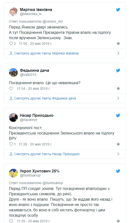 У Києві пройшла інавгурація новообраного Президента України Володимира Зеленського. Шостий глава держави вже вступив на пост. В соцмережах не втомлюються обговорювати цю гучну подію, роблячи прогнози та "розшифровуючи" різні знаки, які були помічені українцями під час інавгурації, передає ONLINE.UA