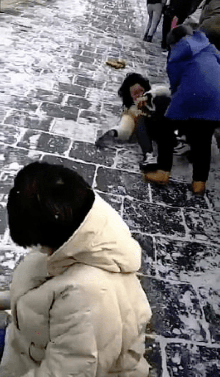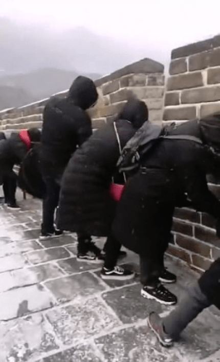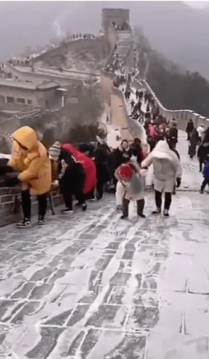 "Через погоду на бруківці пішохідних зон стіни утворилася ожеледиця. Через постійні підйоми і спуски туристи падають і не можуть рухатися далі. Вони тримаються за поручні, щоб піднятися на узвишшя і з'їжджають по крижаній бруківці вниз. Деякі навіть намагаються повзти вгору", - сказано в повідомленні.