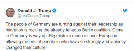 "Народ Німеччини виступає проти свого керівництва у той час, як міграція розхитує й так крихку берлінську коаліцію. Злочинність у Німеччині – зростає. Велику помилку допустили по всій Європі, дозволивши пустити мільйони людей, які так сильно і несамовито змінили їхню культуру", - сказано в повідомленні американського лідера.
