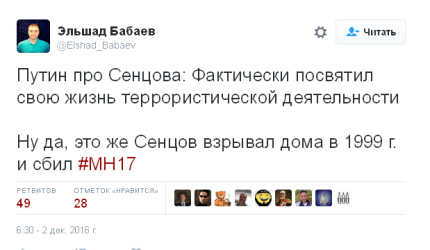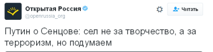 Нагадаємо, у відповідь на пропозицію «вирішити питання» з Сенцовым російський президент відповів: "Сенцов засуджений не за творчість. А за те, що взяв на себе абсолютно інші функції, фактично присвятив своє життя терористичної діяльності".