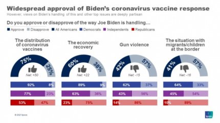 Що важливо розуміти, новий очільник Білого дому має двопартійну підтримку тільки в одному питанні: розподіл вакцин проти коронавірусу. Його діяльність у цій сфері підтримують 92% демократів, 77% незалежних і 53% республіканців. Опитування ABC News/Ipsos проводилось 26-27 березня цього року, було опитано 517 дорослих осіб, статистична похибка 4.9%.